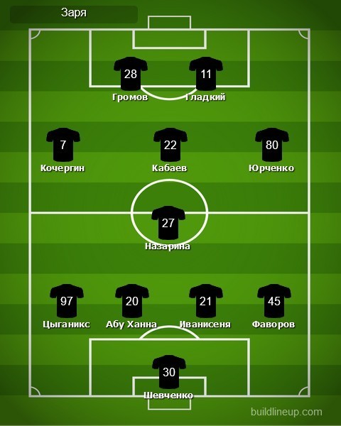 «Заря»: Н. Шевченко – Фаворов (Хомченовский, 87), Иванисеня, Абу Ханна, Цыганикс – Назарина – Юрченко, Кабаев (Лунёв, 77), Кочергин (Поддубный, 87) – Гладкий (Перович, 77), Громов (Гринь, 77).