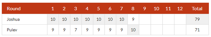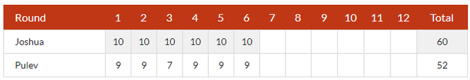 01:20. Cедьмой раунд. Такое впечатление, что Джошуа абсолютно не устал. Мощно пробивает и диктует темп. Апперкот прошел мощнейший! Достоит ли Пулев до конца боя – вот единственный вопрос здесь.Пулев пробил после гонга. Ну вы, наверно, догадались, кто выиграл раунд: 70–61.