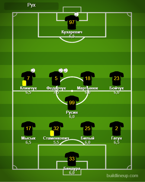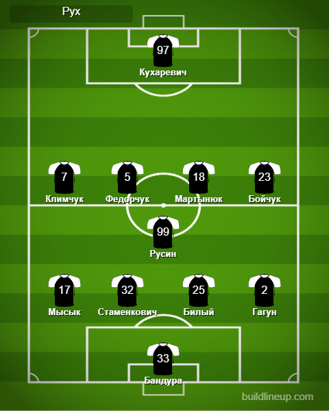 «Рух»: Бандура, Мартынюк, Гагун (Копына, 90), Билый, Стаменкович (Зец, 90), Мысык, Федорчук, Русин, Климчук (Притула, 90), Бойчук, Кухаревич (Кондраков, 68).