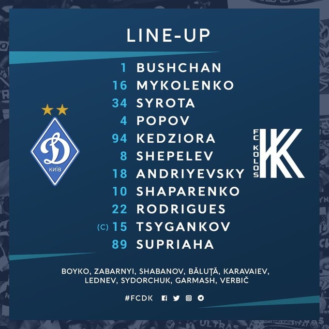 «Динамо»: Бущан, Миколенко, Сирота, Попов, Кендзера, Шепелев, Андриевский, Шапаренко, Родригеш, Цыганков, Супряга.