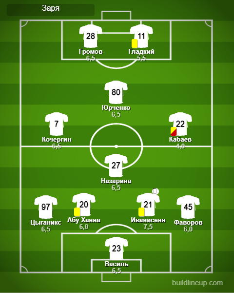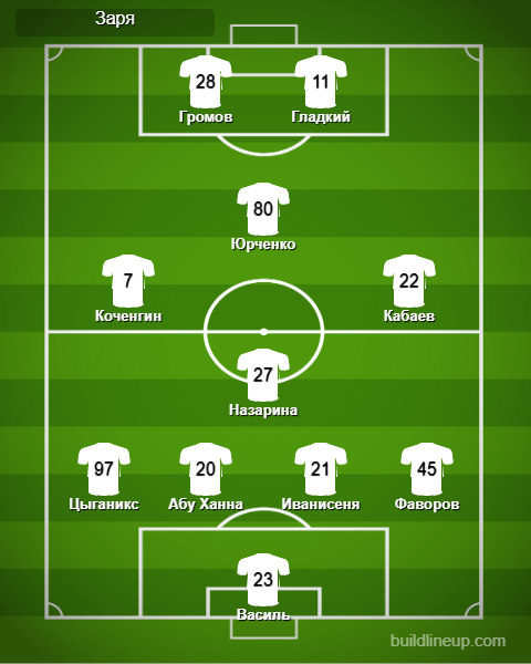 «Заря»: Василь - Фаворов, Иванисеня, Абу Ханна, Цыганикс (Хомченовский, 90+1) - Назарина - Кабаев, Юрченко, Кочергин (Лунев, 90+4) - Гладкий (Аллахьяр, 54), Громов (Перович, 90+4).