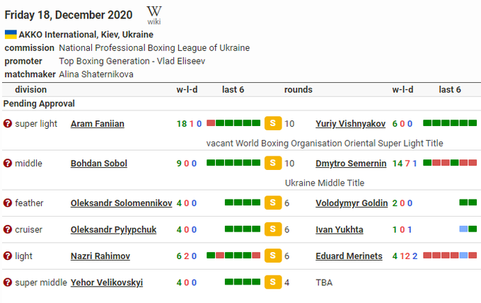В главном бою на ринг выйдут Арам Фаниян из Броваров (18–1, 2 КО) и Юрий Вишняков из Киева (6–0, 3 KO).