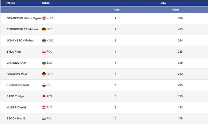 Да, первые три из этих 5 побед были одержаны не без помощи везения, но в целом сейчас Халвор Эгнер находится в феноменальной форме. И перед Турне четырех трамплинов он уходит в отрыв в общем зачете Кубка мира. Преимущество над ближайшим преследователем, Маркусом Айзенбихлером, достигло 137 баллов. А над третьим в общем зачете Робертом Йоханссоном оно составляет уже 356 баллов – кажется, претендентов на Большой хрустальный глобус (БХГ) осталось только двое.