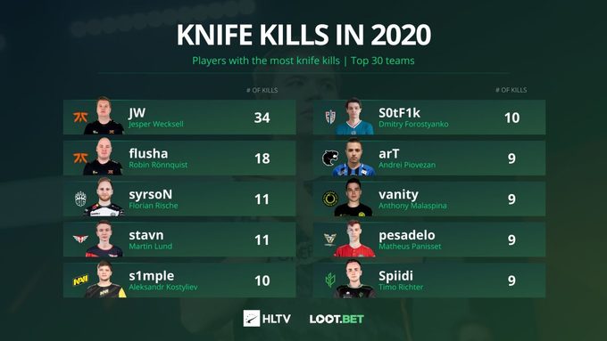 Лидер состава Natus Vincere по CS:GO Александр s1mple Костылев вошел в список по наибольшему количеству убийство ножом в сезоне 2020-го года.