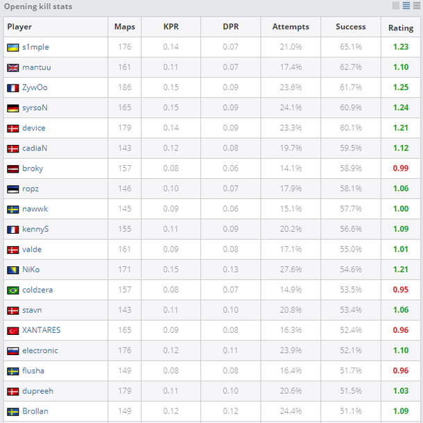 Костылев обошел Матеуша mantuu Вильчевски и Матье ZywOo Эрбо, которые расположились на втором и третьем местах. Они выиграли 62,7 и 61,7% стартовых стычек соответственно.