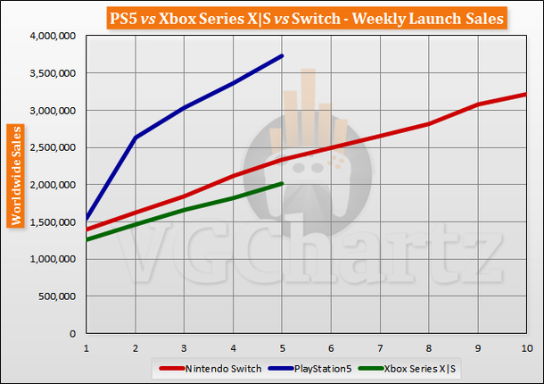 За первые пять недель продаж консоль Sony показала результат в 3,7 млн реализованных устройств, в то время как Xbox купили около 2 млн раз. Для сравнения, Nintendo Switch за аналогичный период после релиза остановилась на отметке 2,3 млн. PlayStation 5 лидирует по продажам во всех проанализированных регионах (США, Европа, Япония).