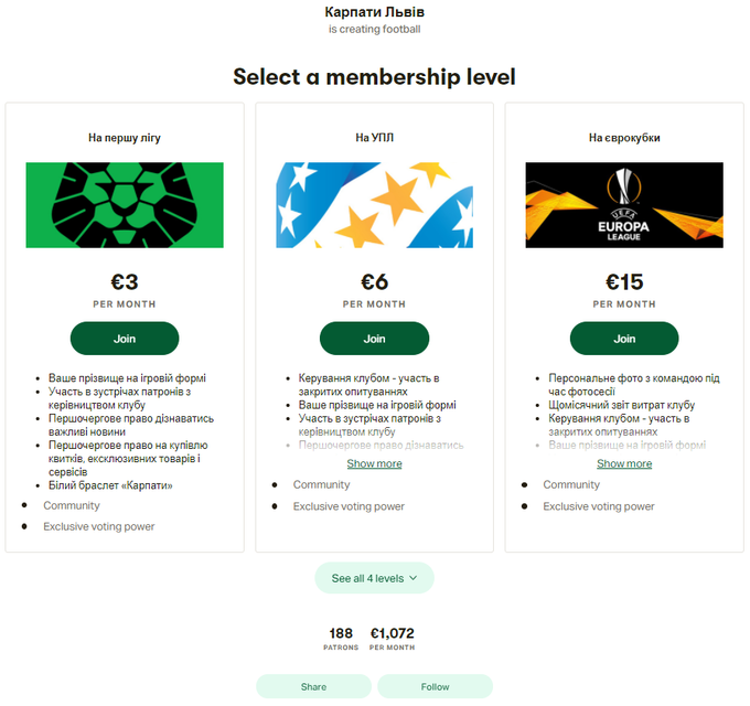 Поклонники могут пожертвовать средства на 4-х уровнях: на Первую лигу (€3), на УПЛ (€6), на еврокубки (€15) и Кубок – Львову! (€30). За первые дни сбора средств «Карпатам» задонатили больше 1000 евро.