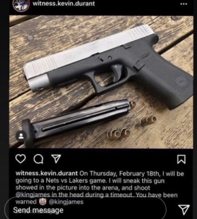 Форвард «Лос-Анджелес Лейкерс» Леброн Джеймс получил угрозу жизни. Пользователь Instagram с ником witness.kevin.durant выложил фото пистолета и написал, что застрелит Джеймса во время матча.