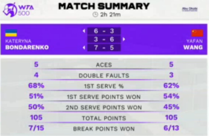 Украинская теннисистка Катерина Бондаренко (№285 WTA) одержала очередную победу на турнире WTA 500 в Абу-Даби.