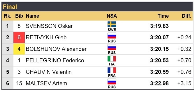 Шведский гонщик Оскар Свенссон выиграл спринт классикой на предпоследнем, седьмом этапе Тур де Ски. Он опередил двух россиян – Глеба Ретивых и лидера общего зачета Александра Большунова.