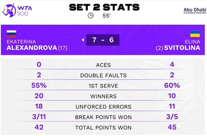 Судьба матча решалась на тай-брейке финальной партии и он вышел максимально интригующим. На этот раз Александрова уходила на переход, ведя 4:2. Она же первой дошла до матчболов при счете 6-5 и 7-6. К счастью, сегодня характер Элины было не сломить, она отдала себя всю и все-таки вырвала победу. Но сама игра немного расстроила, первая серьезная соперница показала, что особого прогресса в игровом плане у Свитолиной в межсезонье все-таки не произошло. Только за счет морально-волевых постоянно побеждать не получится.