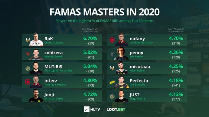 На первом месте расположился RpK (6,7%), на втором капитан Faze Clan — coldzera (5,82%), а тройку закрывает ветеран португальского CS — MUTiRiS (5,04%).
