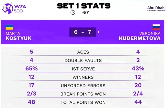 Матч начался для Костюк очень неплохо. Соперница не могла найти свою игру, с точностью были проблемы. В четвертом гейме у россиянки пропала первая подача и Марта оформила брейк под ноль. После этого инициативу перехватила уже россиянка, воспользовавшись затяжным провалом в игре украинки. Кудерметова выиграла четыре гейма из пяти и выходила подавать на сет.