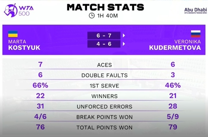 Костюк не сумела выйти в финал турнира в Абу-Даби, проиграв Кудерметовой