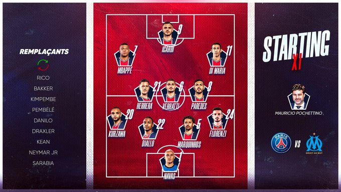«ПСЖ»: Навас, Флоренци, Маркиньос, Диалло, Курзава (Кимпембе, 65), Веррати, Паредес, Эррера, Ди Мария (Неймар,65), Мбаппе, Икарди
