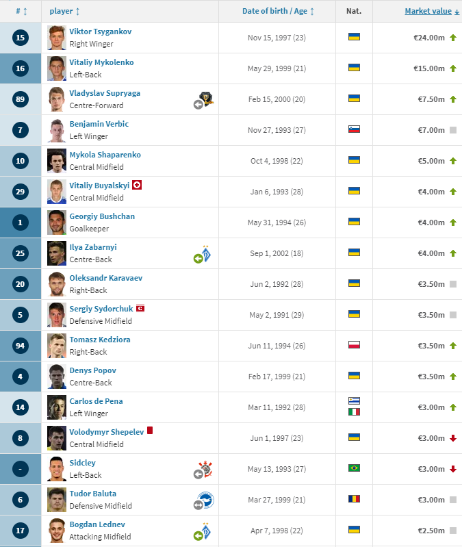 Больше всех в команде стоит хавбек Виктор Цыганков (24 млн евро), это самая высокая цена среди украинских игроков.