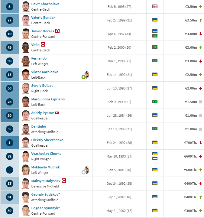 Трансферная стоимость игроков «Шахтера» (данные Transfermarkt)