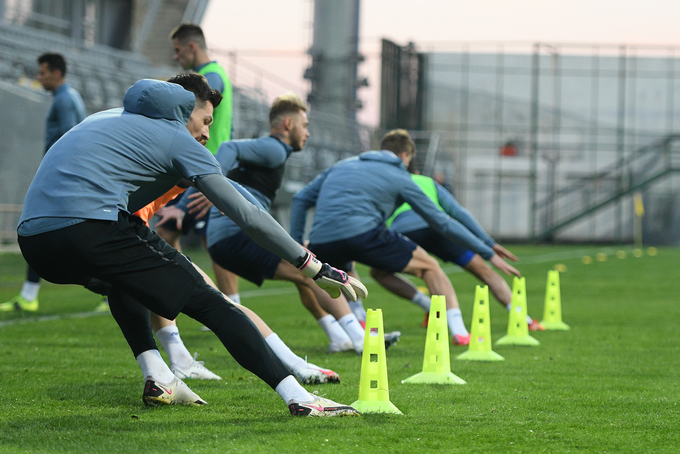 Тренировка началась традиционно – с интенсивной разминки, которую проводил тренер по физической подготовке Виталий Кулыба. Игроки с хорошим настроением выполнили все упражнения, после чего приступили к отработке коротких передач и упражнений с двумя нейтральными. Основной акцент вечернего занятия был сделан на отработку тактических моментов и моделирования ситуаций максимально приближенных к игровым.