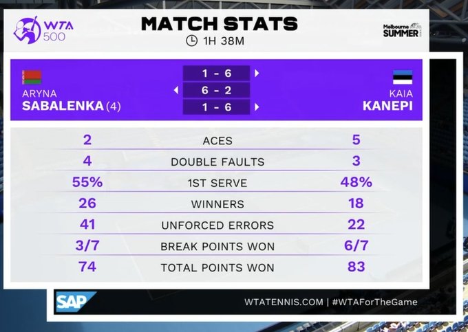 Седьмая ракетка мира Арина Соболенко проиграла 35-летней эстонке Кайе Канепи во втором круге турнира в Мельбурне («Gippsland Trophy»).