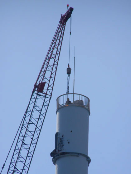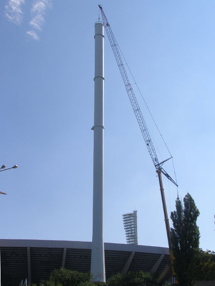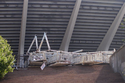 Как видим с опоры уже снята многоярусная платформа, на которой крепились прожекторы. Ее разбирают на земле, под чашей стадиона.