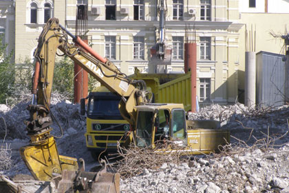 На прошлой неделе приступили к сносу «Троицкого» и со стороны НСК «Олимпийский». По прошествии семи дней темпы сноса с «платформы» НСК увеличились вдвое, поскольку на подмогу прибыла еще одна чудо-машина. Нет, количество техники не прибавилось (как и раньше задействованы три машины). Однако отрадно, что она не простаивает. Вот и сейчас, когда идет очистка территории от мусора возле ул. Красноармейская, железобетон крушат с противоположной стороны.
