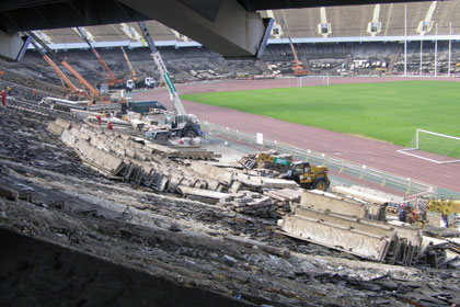 Нижний же ярус главной арены страны практически разобран, осталось «очистить» несколько секторов. Бетонные ступени, на которых были установлены конструкции для крепления индивидуальных сидений, уже готовы к вывозу.