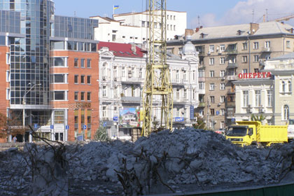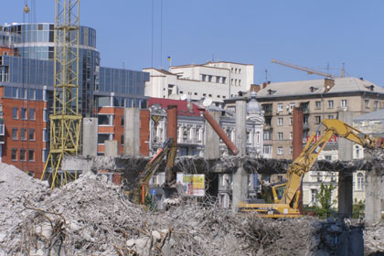 В общем, следует признать, что по прошествии пяти недель, демонтаж комплекса набрал весьма стремительные обороты. Впрочем, остаются участки, к которым рабочие даже не притрагивались – к примеру, со двора гостиницы «Спорт» или со стороны ул. Жилянская. Однако это объясняется достаточно затруднительным подступом к сооружению, а то и вовсе невозможностью задействовать технику на этих участках из-за близости расположенных неподолеку других объектов.