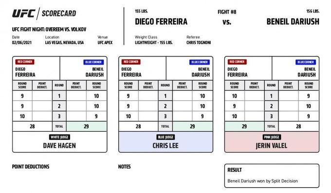 В первом бою основного карда иранец Бенеил Дариуш победил бразильца Диего Феррейру. Иранец одержал победу раздельным решением судей – 28:29, 29:28, 29:28.