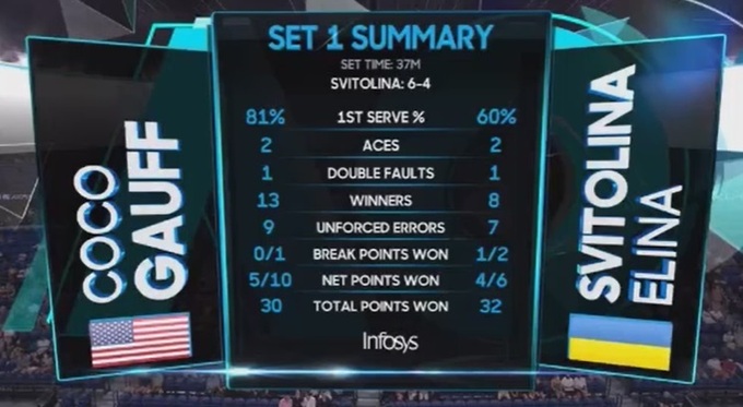 Игра получилась очень высокого уровня, особенно от украинки. Было всего несколько небольших провальных отрезков с ошибками. Подача сегодня была приблизительно средних показателей, как для Элины, что намного лучше, чем в предыдущей встречи. А тот факт, что Гауфф не взяла ни одного гейма на приеме означает, что концентрация Свитолиной была на высоте весь матч. В послематчевом интервью игру Элины назвали одним словом - эффективной. Тяжело с этим не согласиться.
