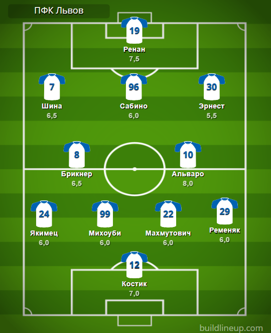 «ПФК Львов»: Костик – Якимец, Михоуби, Махмутович, Ременяк (Грисьо, 83) – Брикнер (Довгий, 57), Алваро (Семенив, 83) – Шина, Сабино, Эрнест (Чиряк, 61) – Ренан (Ныч, 57).