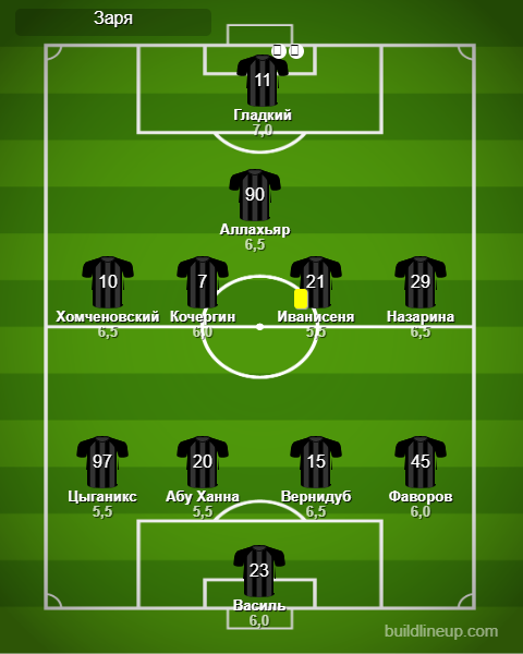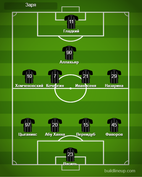«Заря»: Василь – Фаворов, Вернидуб, Абу Ханна, Цыганикс (Жуниньо, 46), Иванисеня – Кочергин, Назарина, Хомченовский (Шахаб, 59), Аллахьяр – Гладкий (Казаков, 90+5).