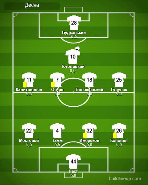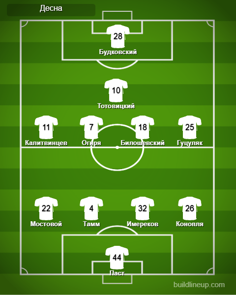 «Десна»: Паст – Конопля (Гитченко, 78), Тамм, Имереков (Арвеладзе, 86), Мостовой (Дегтярёв, 78) – Калитвинцев, Огиря, Билошевский (Домбровский, 66), Гуцуляк (Картушов, 66) – Тотовицкий – Будковский.