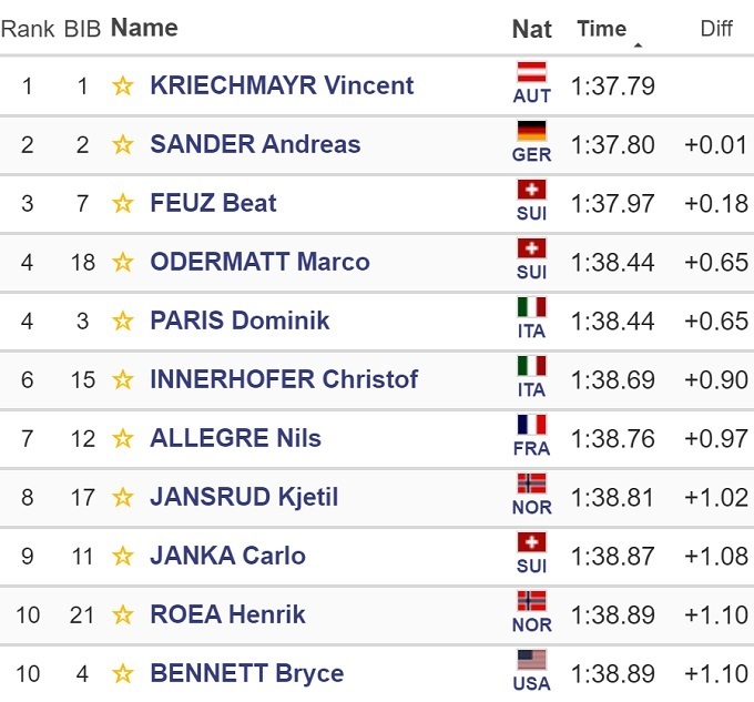 на трасі, яка скоріше нагадувала супер-джі, а не швидкісний спуск Кріхмайєр на одну соту випередив Сандера-вагоме 4-е місце молодого універсала Одермата
