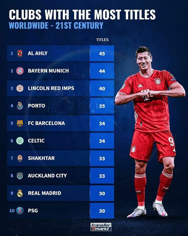 В лидерах находится египетский «Аль-Ахли», у которого 45 трофеев. Немецкая «Бавария», выиграв Клубный ЧМ, подобралась к лидеру вплотную (44 титула).