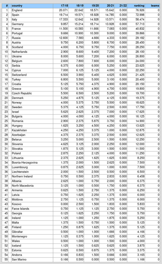 Таблица коэффициентов УЕФА 2021 (влияет на распределение путевок в сезоне 2022/23)
