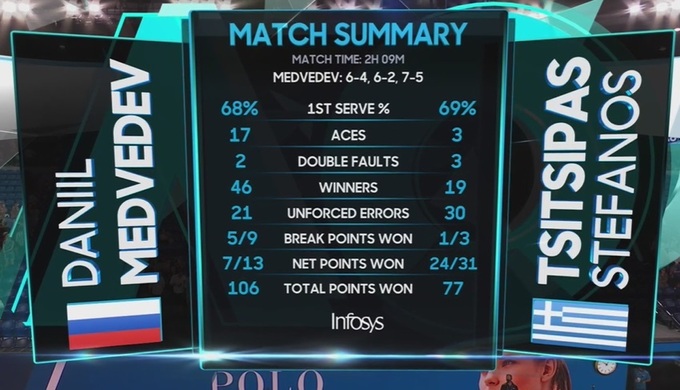 19 февраля состоялся полуфинальный матч Открытого чемпионата Австралии по теннису, в котором россиянин Даниил Медведев (№4 ATP) обыграл грека Стефаноса Циципаса (№6 ATP).