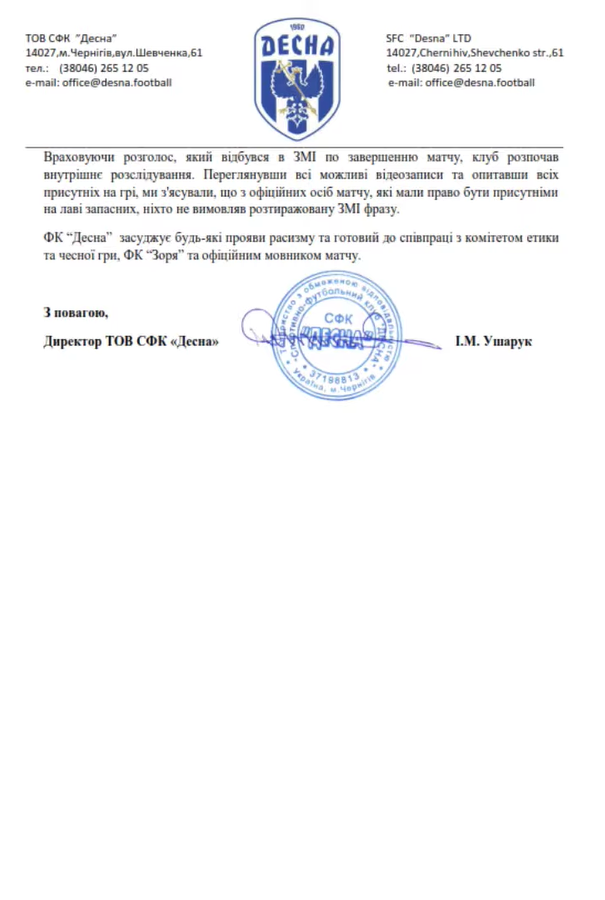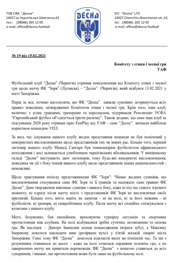 Руководство черниговской «Десны» отправило официальное письмо в адрес Комитета УАФ по этике и честной игре относительно расистского инцидента, который случился в матче против «Зари» в 14-м туре УПЛ. В письме «Десны» сказано: