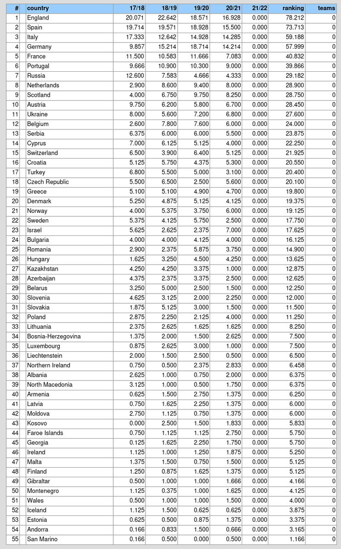 Таблица коэффициентов УЕФА 2021 (влияет на распределение путевок в сезоне 2022/23)