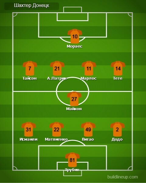 «Шахтер»: Анатолий Трубин, Додо, Николай Матвиенко, Витао, Исмаили, Майкон, Алан Патрик (Маркос Антонио, 65), Тете (Манор Соломон, 76), Ромеро Марлос, Тайсон, Жуниор Мораес
