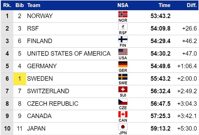 Главной сенсацией стал провал действующих чемпионок в этом виде программы, сборной Швеции, которая стала лишь шестой. Сборная Украины была закрыта на круг и до финиша не добралась.