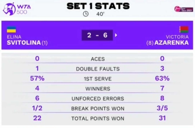 Внимательные комментаторы заметили, что данный факт очень повлиял на игру и Свитолиной. Она больше переживала о том, что происходит по другую сторону корта, нежели о своих действия. Из-за этого игра Элины была средней паршивости. Вместо того, чтобы втягивать травмированную соперницу в затяжные розыгрыши, она выбирала не лучшие варианты развития атак и частенько ошибалась. Азаренко же старалась быстро завершать, мастерство ей это в большинстве случаев позволяло.