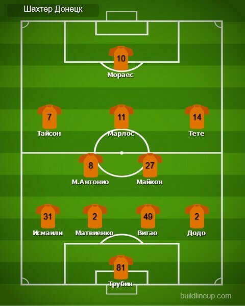 «Шахтер»: Трубин, Додо, Матвиенко, Витао, Исмаили, М.Антонио (Дентиньо, 71), Майкон, Марлос, Тете (Коноплянка, 90), Тайсон (Соломон, 80), Мораес (Судаков, 72)
