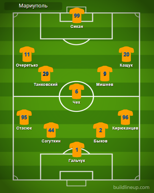 «Мариуполь»: Гальчук – Стасюк (Драмбаев, 61), Сагуткин, Быков, Кирюханцев – Чех (Мампасси, 39) – Очеретько (Бондаренко, 61), Танковский, Мишнев, Кащук (Горбунов, 61) – Сикан (Кулаков, 41).