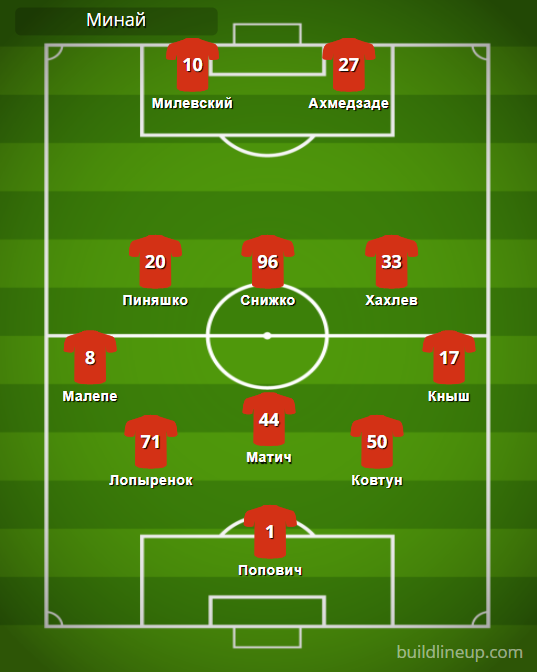 «Минай»: Попович – Малепе, Лопыренок (Карась, 55), Матич (Маембе, 60), Ковтун, Кныш – Пиняшко (Кополовец, 71), Снижко, Хахлев – Милевский (Шиндер, 60), Ахмедзаде (Кожанов, 55).