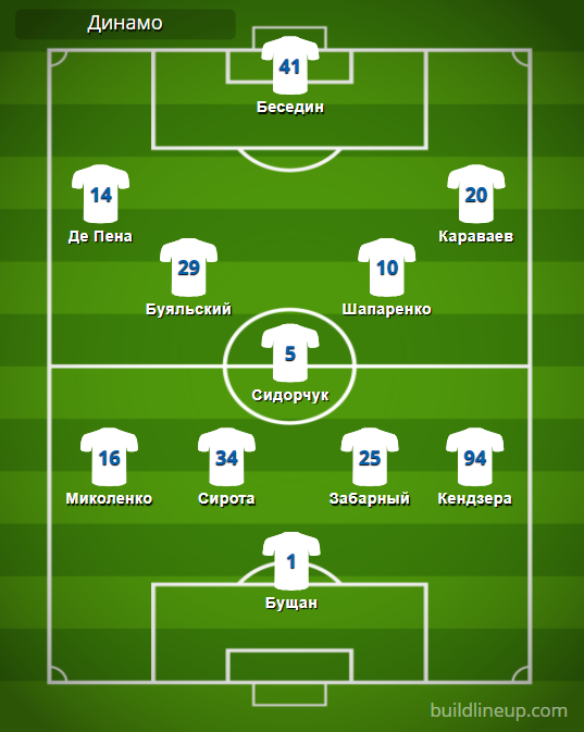 «Динамо» Киев: Бущан – Миколенко (Сидклей, 81), Сирота, Забарный, Кендзера (Родригес, 63) – Сидорчук – Де Пена (Дуэлунд, 72), Буяльский (Андриевский, 81), Шапаренко (Шепелев, 63), Караваев – Беседин.