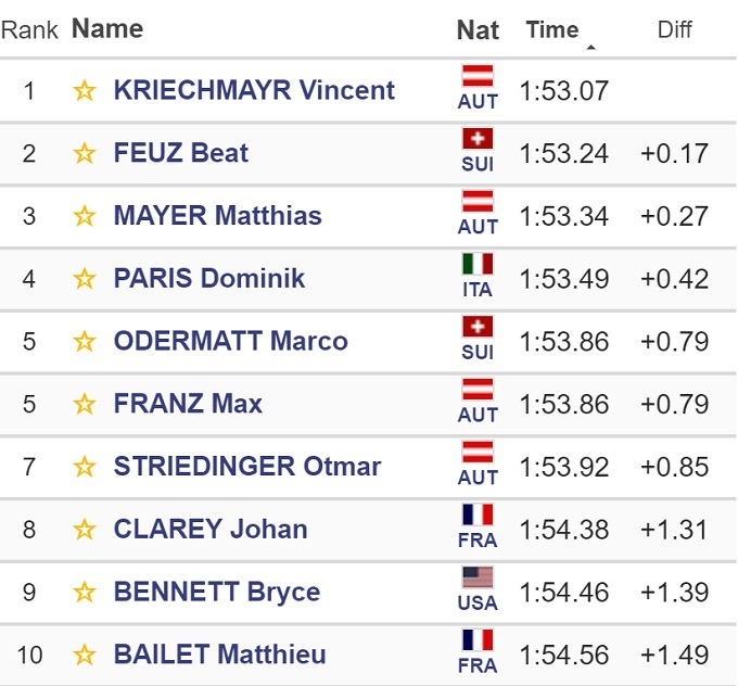 Австрийский горнолыжник Винсент Крихмайр выиграл скоростной спуск на домашнем этапе Кубка мира в Заальбах-Хинтерглемме. Он опередил швейцарца Беата Фойца и партнера по команде Маттиаса Майера.
