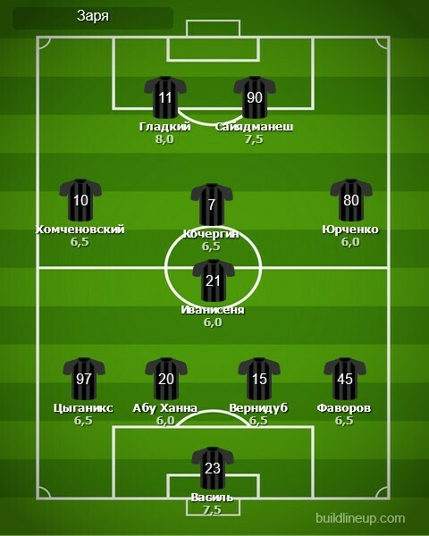 «Заря»: Василь, Д.Фаворов (Цвек, 64), Вернидуб (Руфати, 64), Абу Ханна, Цыганикс (Емец, 80), Иванисеня, Кочергин, Хомченовский, Юрченко, Сайядманеш (Громов, 46), Гладкий (Шахаб, 46)