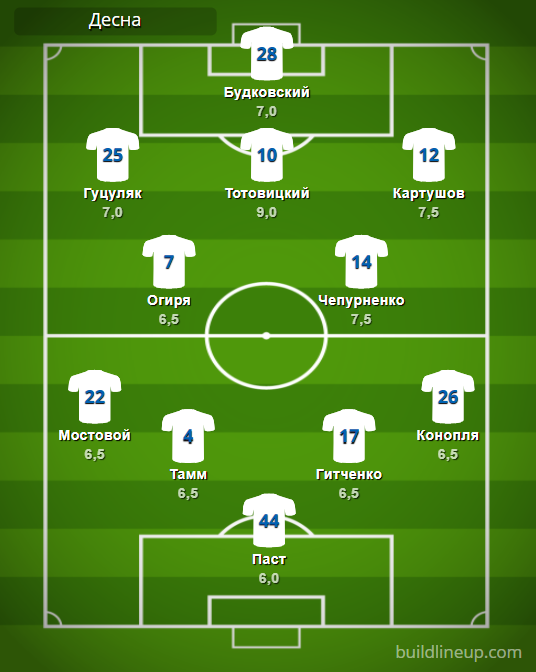 «Десна»: Паст – Мостовой (Сухоцкий, 82), Тамм, Гитченко, Конопля (Полегенько, 86) – Огиря, Чепурненко (Ермаков, 76) – Гуцуляк, Тотовицкий, Картушов (Калитвинцев, 76) – Будковский (Дегтярев, 82).
