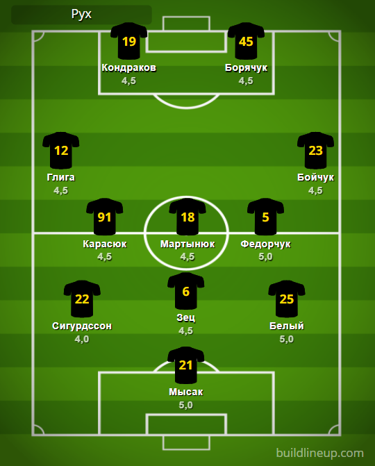 «Рух»: Мысак – Сигурдссон (Гагун, 46), Зец, Белый – Глига, Карасюк, Мартынюк (Сыч, 46), Федорчук, Бойчук (Карабин, 85) – Кондраков (Кухаревич, 66), Борячук (Климчук, 46).
