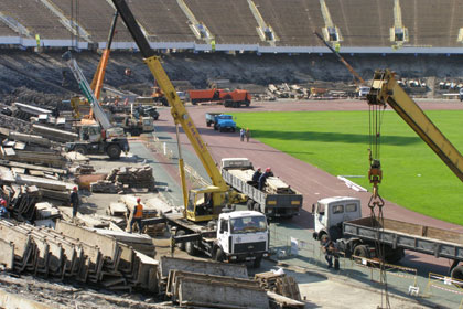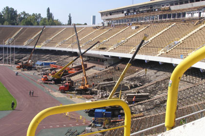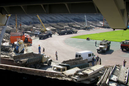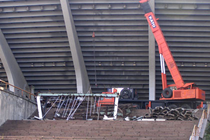 Над очисткой нижнего яруса стадиона работают не меньше 15-ти автокранов! Практически к каждому из них подъезжают машины, на которые грузят бетонные ступени, на которых фиксировались индивидуальные сидения.